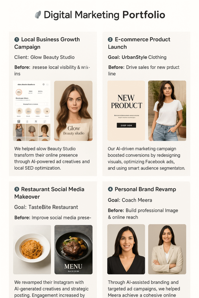 We helped Glow Beauty Studio transform their online presence through AI-powered ad creatives and local SEO optimization. Within 30 days, the salon gained 2x engagement and 40% more bookings.